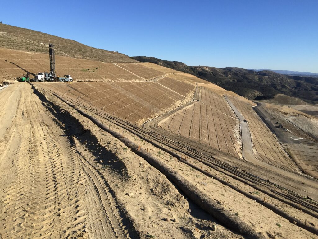 The detection of the slope failure plane was conducted by Time-Domain Reflectometry techniques (TDR Cable). They were installed at three boreholes with an average depth of 400’/each. The cables were monitored manually with a read-out unit provided by the owner, OC Waste and Recycling.